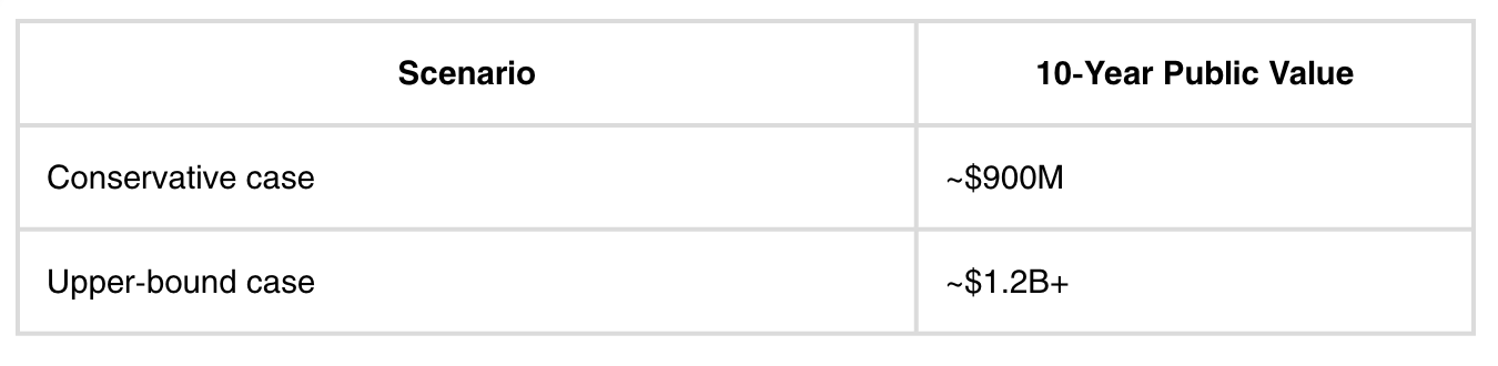At conservative growth rates (2–3% annually), the EcoPark could generate $900 million to $1.2 billion in combined economic benefit and cost avoidance over its first decade — far exceeding its initial capital investment.